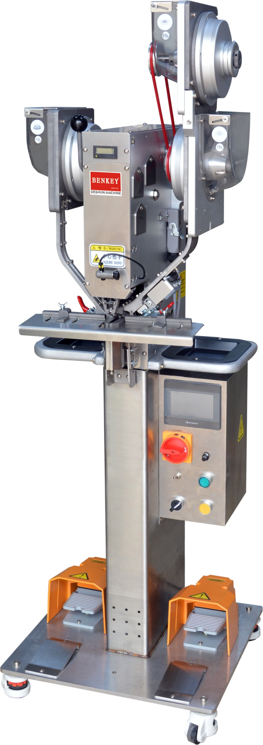 把鈕扣放進對應的4個料斗,開機會自動轉(zhuǎn)動料斗,自動把鈕扣排滿軌道,自動把鈕扣送到上下模具,電動伺服馬達帶動,只要踩下踏腳開關便可裝訂自如,簡單易用。上下模具對向運動,穿透力好。更換配件可以裝訂其它鈕扣。